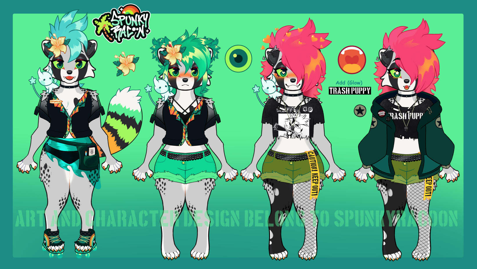 Spunky was a lost soul who lived on Alleystreet Way. She spent her days dumpster diving, slappin' art around the city and getting away with any crime she needed in order to survive. This punk racc was worn down by the rough city life but had the street smarts to outrun the pigs. One day she wasn't so lucky and was a hair away from imprisonment. She took a leap of faith into the ocean, in hopes she wouldn't be seen by this town ever again.She washed upon a shore, greeted by a small creature. A WishSprite named Bloop. There, she felt relaxed and ready to turn a new leaf. A cozy resort of foraging, sharing what you can and bartering. After rejecting society so long, it turned out this wholesome community lifestyle was just what she needed to thrive. With the help of the WishSprites, they were able to build a place of their own together. With Spunky's height and skills, she was able to help the sprites in ways they didn't know they needed. They lovingly nicknamed their island "Spunky Town Resort" as she became very involved in everyone's lives. Spunky had never felt so adorned and wanted to do everything she could to show her appreciation back. She started up her own cafe & smoothie bar, introducing fun new foods the Wish Sprites had never heard of.At "work" she wears a waitress uniform the Wishsprites lovingly handmade, delivering fresh orders with a pair of rollerskates. During her after hours, she still loves to dress in more rebellious outfits for comfortability.